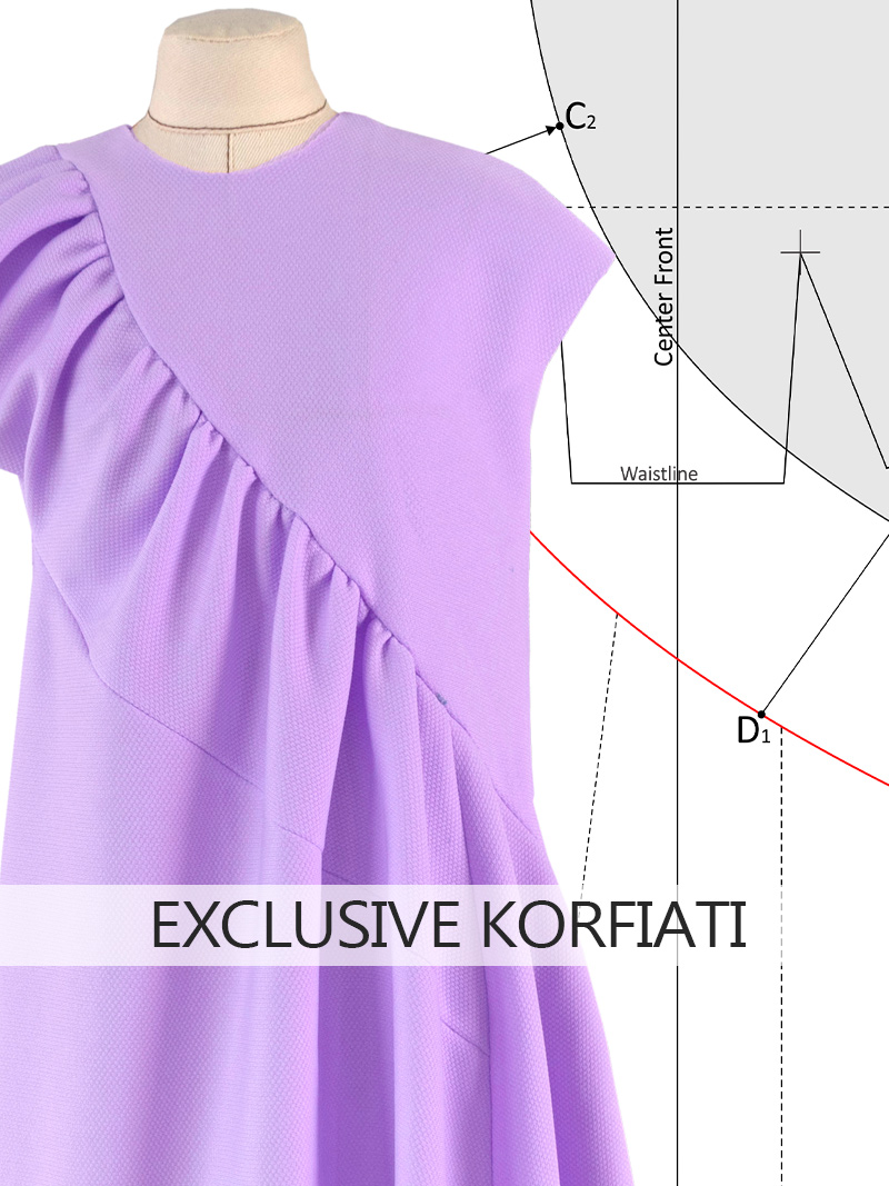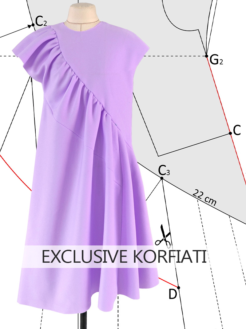 At the request of our subscribers, this lesson demonstrates how to draft a loose-fit dress with an original asymmetrical cut, a round neckline, and an inset flounce. The model is constructed on a scaled dress form.