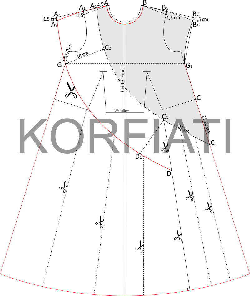 Deepen the armhole: GG1 = 5-6 cm (2″-2 3/8″) (this value may be increased). From point G1, draw a dashed line to the right; the intersection defines point G2. Connect points B3 and G2 with a slightly curved line.