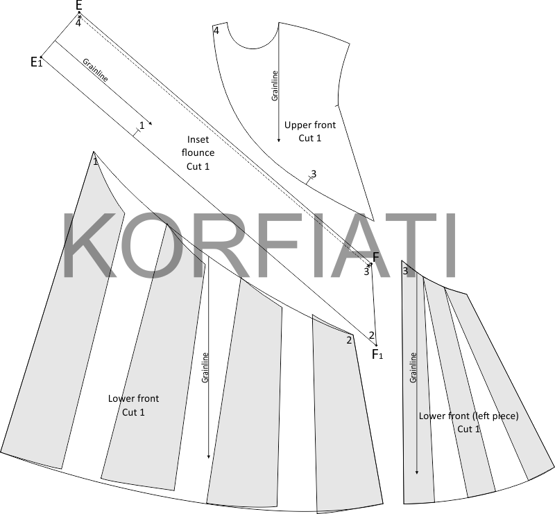 Cut the front pattern along the drafted lines. The inset flounce is drafted as a replacement for piece A0–C3–D–A3 and corresponds to piece E–F–E1–F1: