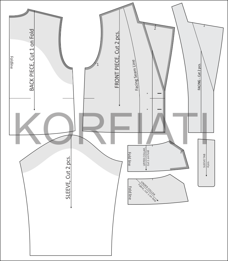 - Back Lining: 1 piece (on the fold, add a pleat for ease of 2 cm at the center back).