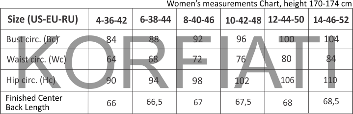 Finished Center Back Length for sizes 42-52: 66 cm – 66.5 cm – 67 cm – 67.5 cm – 68 cm – 68.5 cm.