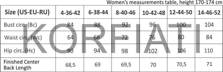Finished Center Back Length for sizes 42-52: 68,5 cm – 69 cm – 69,5 cm – 70 cm – 71,5 cm – 72 cm.